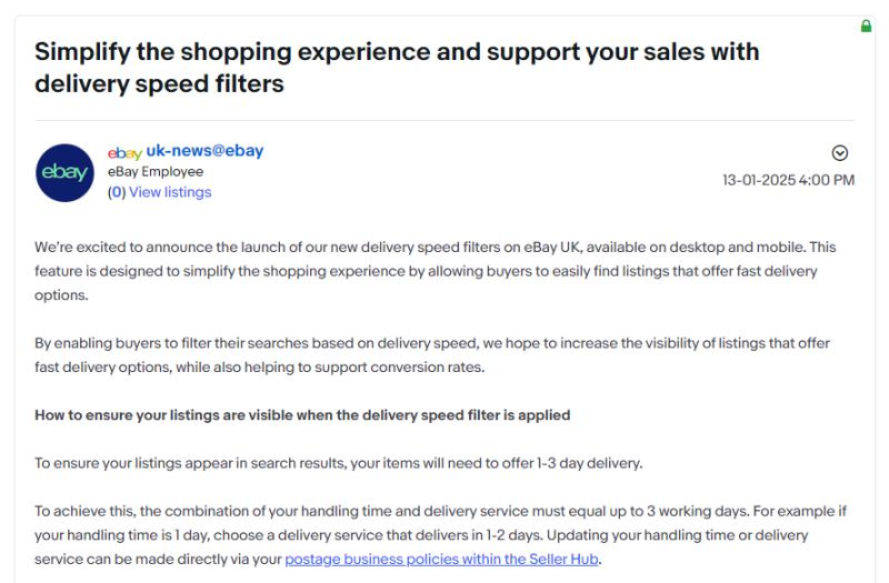 1月17日消息,eBay英國站推出了全新的送貨速度篩選器,旨在簡化購物體驗,幫助買家更容易找到提供快速送貨選項的商品。該功能允許買家在搜索時根據送貨速度進行篩選,提升提供1-3天快速送貨服務商品的可見性,同時有助于提高賣家的轉化率。eBay表示,商品若要在搜索結果中顯示,必須提供1-3天的送貨服務。