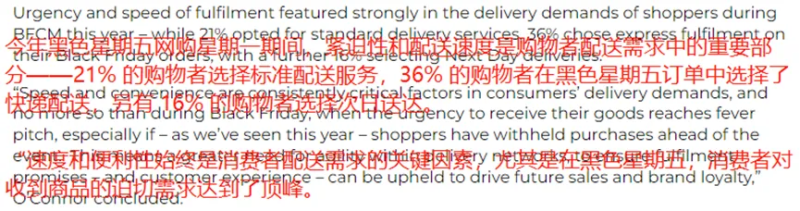 據物流服務商Scurri此前發布的數據顯示,在2024年黑五網一期間,有36%的英國消費者選擇了快速送貨服務,21%的消費者選擇標準配送服務,另外還有16%的消費者選擇了次日達送貨服務。?