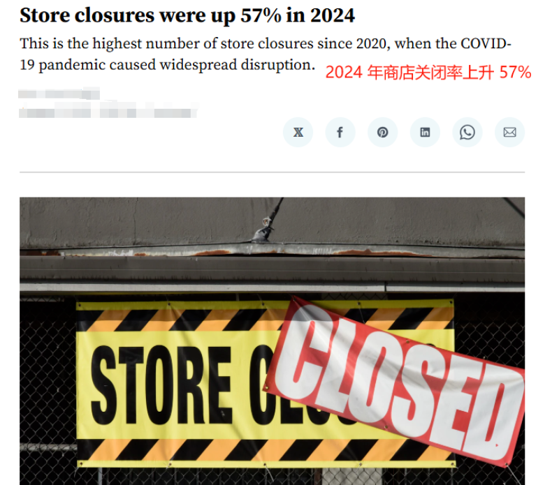據(jù)Coresight Research發(fā)布的數(shù)據(jù)顯示,2024年全美約有7327家零售店關(guān)門,這個(gè)數(shù)字與2023年相比暴漲了57.8%,也是自2020年以來(lái)商店關(guān)閉數(shù)量最多的一年