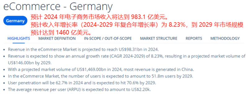 根據(jù)Statista提供的數(shù)據(jù),2024年德國電商市場的規(guī)模預(yù)估為983.1億美元。2024—2029年期間,這一市場的復(fù)合年增長率預(yù)計為8.23%。到了2029年時,該市場的規(guī)模將有望增長到1460億美元,電商用戶數(shù)量也預(yù)計會達(dá)到5180萬,電商用戶滲透率則預(yù)計會升至70.6%,比2024年增長7.9個百分點。