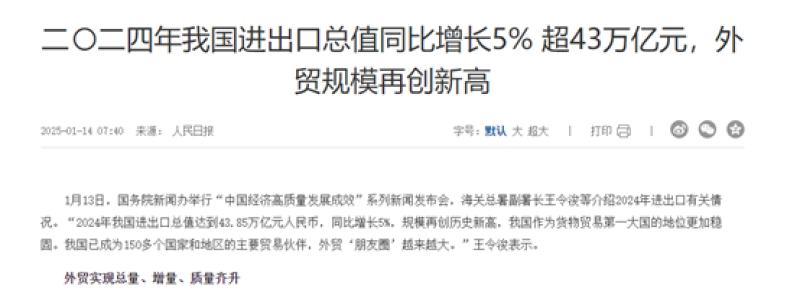 在近期舉行的“中國經(jīng)濟高質(zhì)量發(fā)展成效”系列新聞發(fā)布會中,中國海關(guān)總署副署長王令浚公開了一則數(shù)據(jù):2024年全年我國進(jìn)出口總值達(dá)到43.85萬億人民幣,同比增長5%,規(guī)模再創(chuàng)歷史新高。