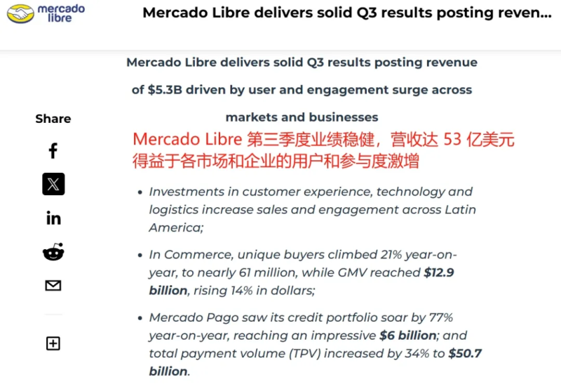 隨著賣家池越來越大,美客多的發(fā)展一路狂飆不止。在最新公布的2024年第三季度財報中,美客多實現(xiàn)營收53億美元,同比增長35%;GMV為129億美元,同比增長14%;凈利潤達到3.9億美元,同時平臺還新增了近700萬名買家。