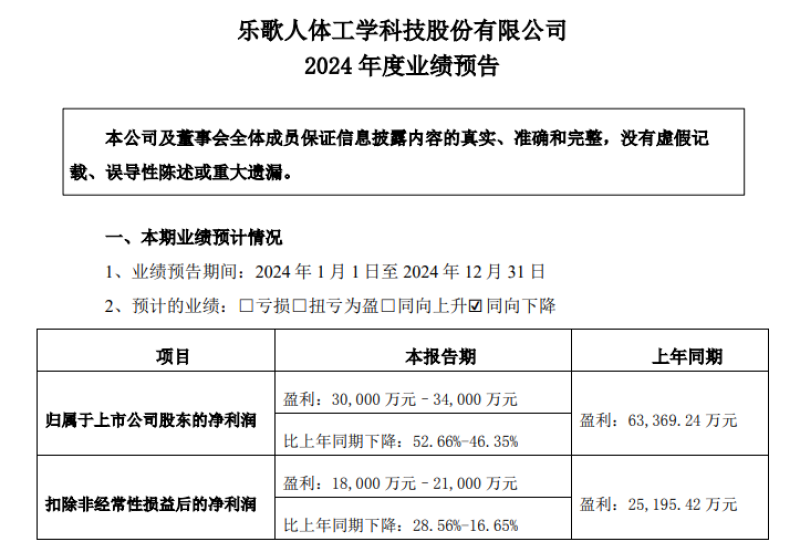 近日,樂(lè)歌股份發(fā)布了2024年度業(yè)績(jī)預(yù)告,預(yù)計(jì)歸屬于上市公司股東的凈利潤(rùn)為3億元至3.4億元,同比下降52.66%至46.35%;扣除非經(jīng)常性損益后的凈利潤(rùn)為1.8億元至2.1億元,同比下降28.56%至16.65%。