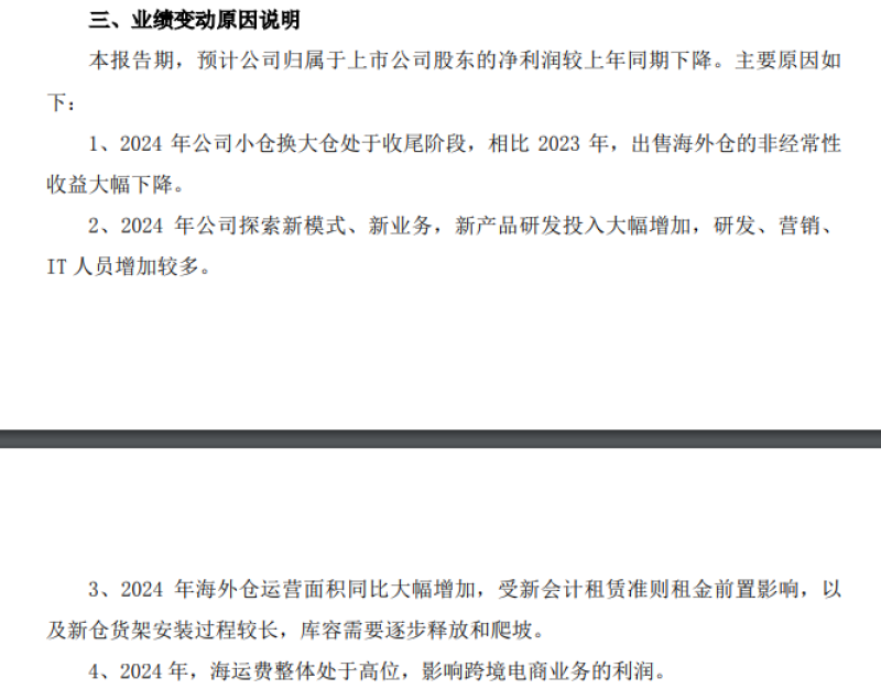 對(duì)于業(yè)績(jī)變動(dòng)的原因,樂(lè)歌股份主要?dú)w結(jié)于四個(gè)方面。一是出售海外倉(cāng)的非經(jīng)常性收益大幅下降;二是公司探索新模式、新業(yè)務(wù),新品研發(fā)投入大幅增加;三是海外倉(cāng)運(yùn)營(yíng)面積大幅增加,庫(kù)容需要逐步釋放和爬坡;四是海運(yùn)費(fèi)整體處于高位,跨境電商業(yè)務(wù)利潤(rùn)受到影響。