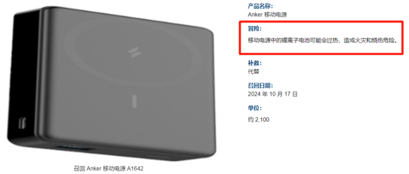 Anker充電寶被召回原因 圖源:美國消費品安全委員會
