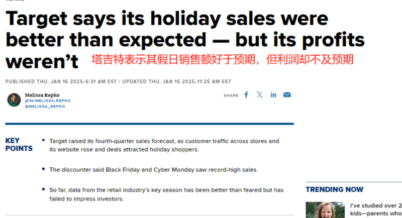不過,降價促銷本來就意味著壓縮賣家利潤空間,在旺季這個優惠扎堆的日子里,Target想脫穎而出,就得比別人更舍得下血本,而價格跳水的背后,是平臺利潤進一步承壓。數據顯示,盡管假日銷售超預期,但Target第四季度利潤預測保持不變,漲營不漲利。