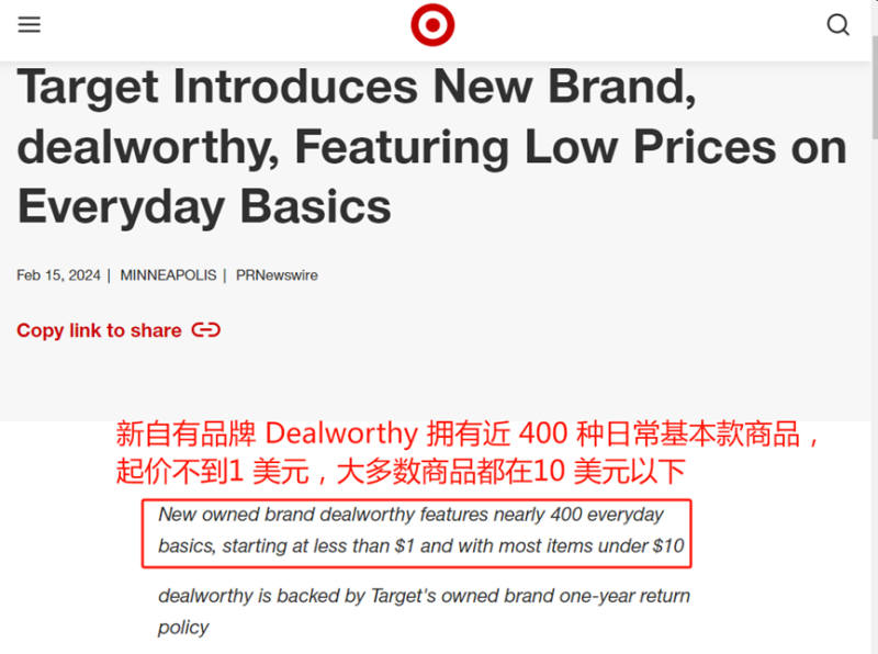 去年二月份,Target宣布推出一個名叫Dealworthy的新低價自有品牌,主打物美價廉,產品的起步價不足1美元,大部分產品的售價都低于10美元。同年5月,該平臺又宣布大約有5000件商品會降低銷售價格,幫助消費者在夏季購物中節省了數百萬美元。