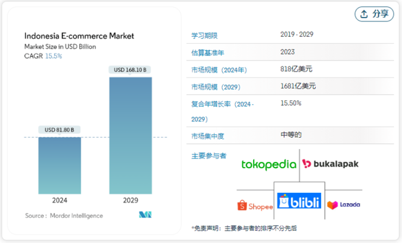 根據Mordor Intelligence發布的數據,2024年,印尼電商市場的規模大約為818億美元,這一數字到2029年有望飆升至1681億美元,在這期間預計復合年增長率為15.5%。來自Statista提供的數據同樣指出印尼電商市場擁有巨大的紅利,電商用戶滲透率將從2024年的23.9%增長到2029年的34.8%。一系列的數據怎么不能算是一種質的飛躍呢?