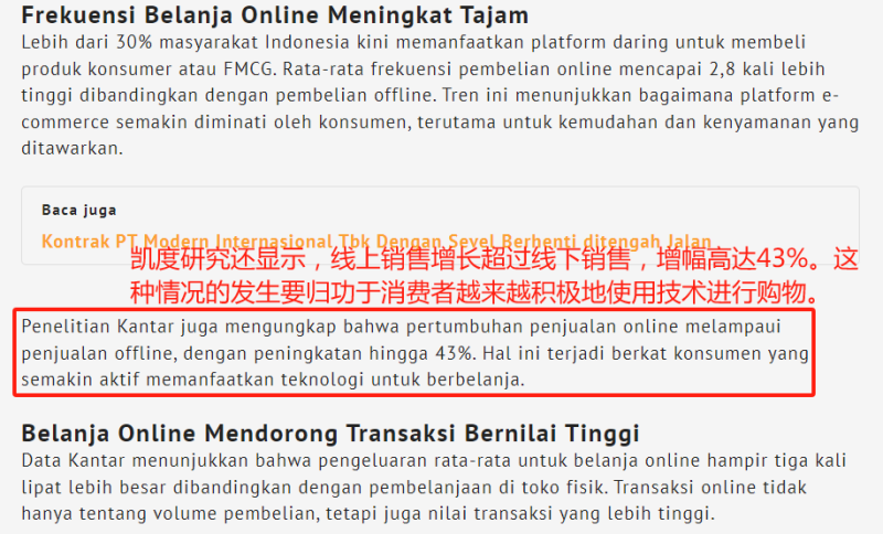 近些年來,越來越多的印尼消費者轉向電商平臺購物,購買頻率和支出明顯高于線下購物。據悉,目前約有超過30%的印尼消費者會網購消費品或快速消費品,購物頻率是線下的2.8倍,線上購物的支出比例幾乎是線下支出的三倍。凱度研究的數據也表明印尼的線上銷售增速遠超線下,增長率高達43%。這一增速不僅遠超傳統零售渠道,也高于許多其他國家的電商市場。