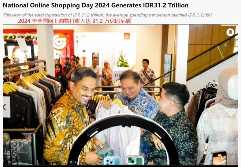 在去年的雙十二活動期間,印尼電商市場的交易額、訂單量都拿下了亮眼戰績,帶動印尼2024年的電商銷售額直攀新高峰;在一年一度的全國網上購物日(Harbolnas)大促期間,印尼人同樣展現出了強烈的購物熱情,參與大促的消費者數量達到了驚人的9800萬,他們創造了31.2萬億印尼盾的電商交易額,同比2023年大漲21.4%。