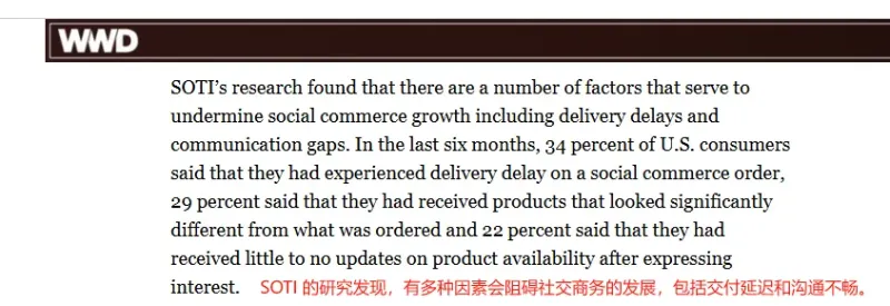 除了網購時的信任危機外,延遲交付、溝通不暢等因素也制約著社交電商的發展。在過去6個月里,34%的消費者表示在社交電商訂單中遇到了交付延遲的問題,29%的人表示他們收到的產品與訂購的存在明顯差異,22%的人表示向商家詢問產品信息后,沒有得到回復。
