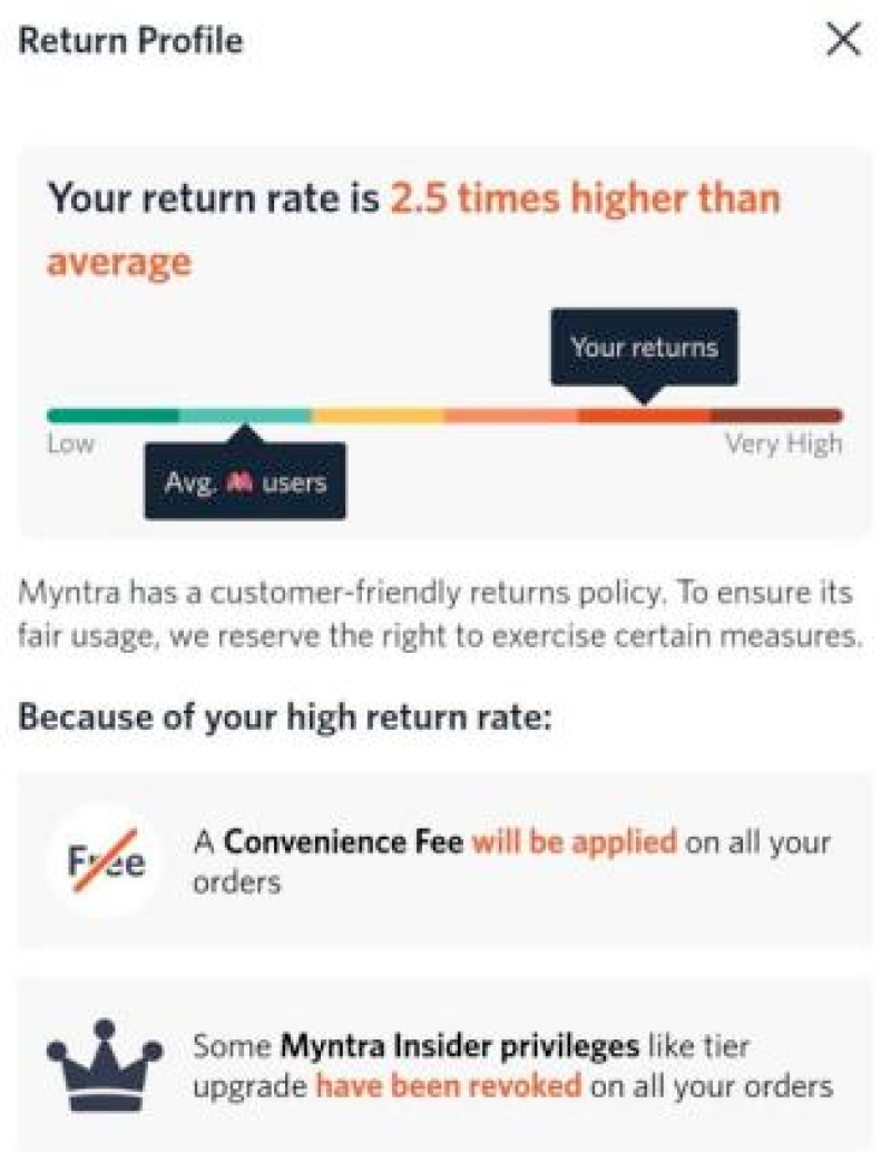 此前,F(xiàn)lipkart、Myntra等平臺就傳出消息開始向高退貨率的用戶收取更高的費用,甚至有人表示收到了“比普通客戶高7倍的退貨率”,消費者在Myntra上頻繁退貨也可能導(dǎo)致賬戶被暫停使用。雖然這一定程度上能減少退貨情況的產(chǎn)生,但弊端也顯而易見,那就是會造成消費者的嚴(yán)重流失。