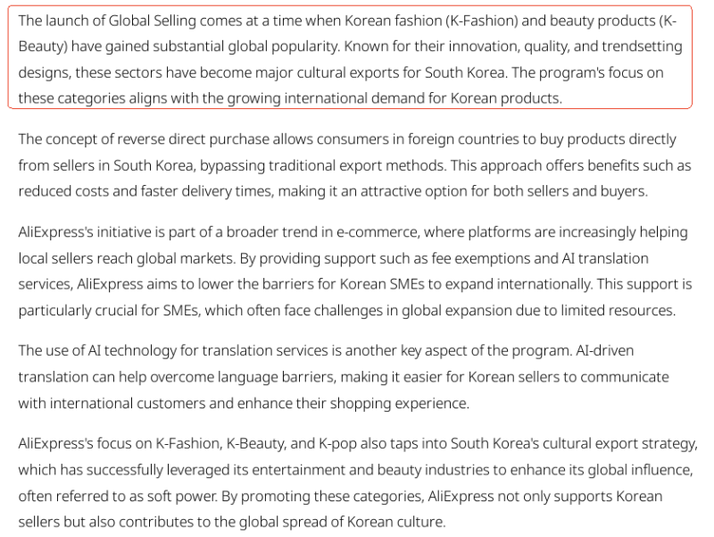 該計劃目前正在積極招募賣家和品牌加入,重點關注韓國的化妝品、時尚和K-pop(韓國流行文化)類產品,時尚領域將包括韓國服裝購物商城和新興設計師品牌。速賣通聚焦韓國時尚、美容、流行文化的策略,也與韓國的文化輸出戰略高度契合。
