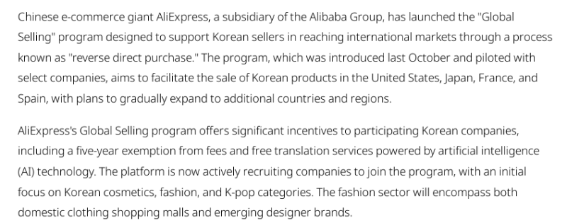 該計劃于2024年10月首次推出,并在部分賣家和品牌中進行了試點,速賣通計劃通過此舉推動韓國產品在美國、日本、法國和西班牙等市場的銷售,未來還將逐步擴展至更多國家和地區。