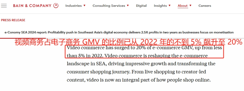 此前,谷歌、淡馬錫和貝恩公司聯(lián)合發(fā)布了《2024東南亞數(shù)字經(jīng)濟(jì)報(bào)告》,報(bào)告預(yù)測,2024年,數(shù)字經(jīng)濟(jì)的商品交易總額將達(dá)到2630億美元,比上一年增長15%。而在東南亞電商持續(xù)增長的背景下,內(nèi)容電商在電商生態(tài)的地位愈發(fā)顯著,直播帶貨GMV的占比已經(jīng)從2022年的不到5%,躍升至20%。