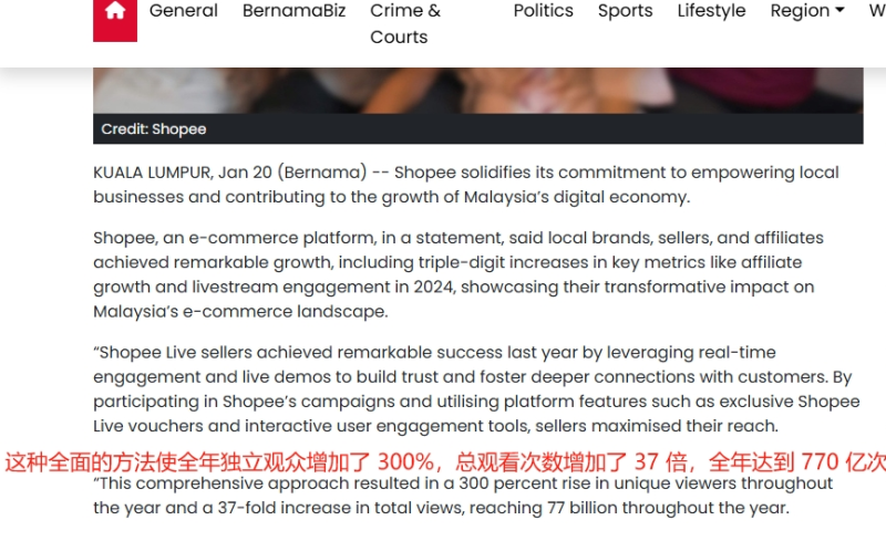 近日,有數(shù)據(jù)顯示,2024年Shopee馬來西亞站在多方面表現(xiàn)都有顯著增長,特別是在Shopee Live上,獨(dú)立觀眾數(shù)量增長了300%,總觀看次數(shù)激增了37倍,全年達(dá)到770億次,成績十分漂亮。