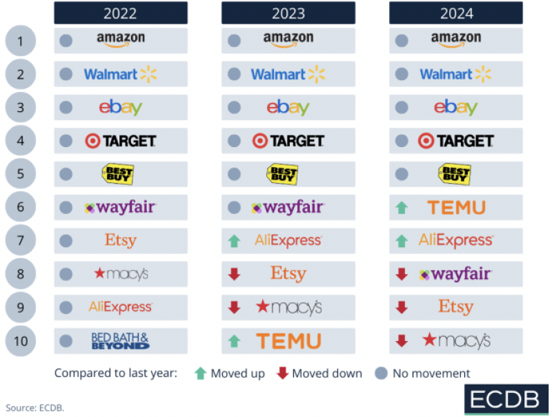 日前,電商數據分析網站ECDB發布了2024年美國電商平臺排行榜,揭示了美國電商市場的最新格局。在這場激烈的競爭中,亞馬遜、沃爾瑪、eBay、Target和Best Buy依然穩居前五名,而中國電商平臺AliExpress和Temu的強勢崛起,則成為本次榜單的最大亮點,分別占據了第六和第七名的位置。
