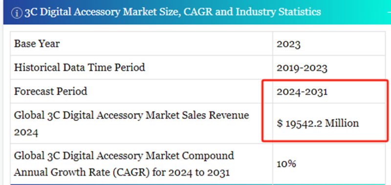 數據顯示,2024年全球3C數碼配件市場規模將達到195.42億美元,預計到2031年將銷售額將達到380.82億美元。