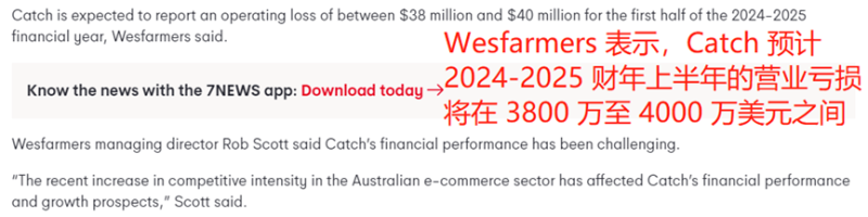 在2021年的時候,Catch還能有5.28億澳元(約合3.3億美元)的銷售額,然而上個財年,這一數(shù)字就下降到了2.27億澳元,直接腰斬。不僅如此,Catch的虧損局面也始終沒能扭轉,根據(jù)其母公司W(wǎng)esfarmers提供的數(shù)據(jù),2024-2025財年上半年,Catch的營業(yè)虧損預估在3800萬—4000萬美元之間。巨額的虧損,最終使Catch走到了關停的境地。