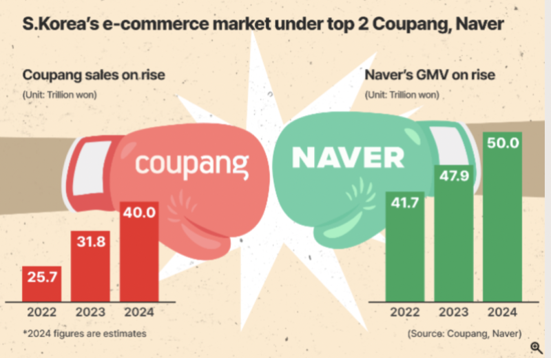 據韓國證券行業最新數據顯示,2024年Coupang銷售額約40萬億韓元,是韓國零售市場史上最高的年度銷售額,而同時這也標志著,Coupang線上和線下門店的總銷售額均已破紀錄;與此同時,2024年Naver的電商業務也實現2.15萬億韓元的銷售額,成為繼搜索業務之后的第二大收入來源,GMV超過50萬億韓元。