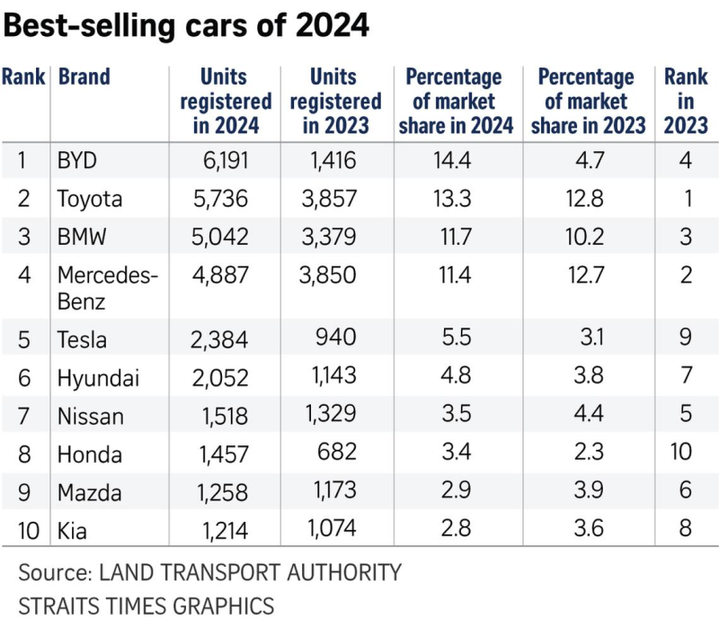 比亞迪拿下新加坡銷量第一 圖源:straitstimes