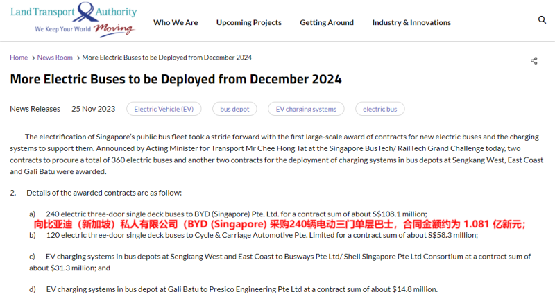 除了一般的消費(fèi)級產(chǎn)品,比亞迪的商用車型在新加坡表現(xiàn)同樣不俗。早在2023年底,比亞迪就拿下了一筆LTA的電動公交車大單。據(jù)公開文件信息,LTA計劃采購360輛電動公交車,其中240輛由比亞迪負(fù)責(zé)生產(chǎn)交付,合同金額約為1.081億新元(約合5.8億元)。預(yù)計2024年12月起,這批電動公交車將陸續(xù)投入使用。