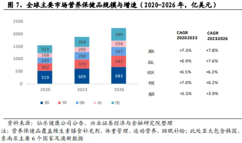 數據顯示,全球保健品行業規模在2023年就已經達到了驚人的1873億美元,美國是全球最大的成熟市場,所占比例為32.51%,位列第二的是中國市場,占比19.75%,緊隨其后的是歐洲和亞太地區。值得一提的是,這些市場的復合年均增長率在未來幾年都將保持較高的水準。