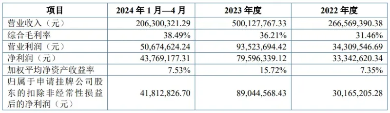 到了2024年,高騰機電的發展勢頭更猛了,僅在前四個月,該公司就實現營收2.06億元,歸屬于申請掛牌公司股東的扣除非經常性損益后的凈利潤為4181萬元,幾乎快要趕上2022年全年的業績數據了。