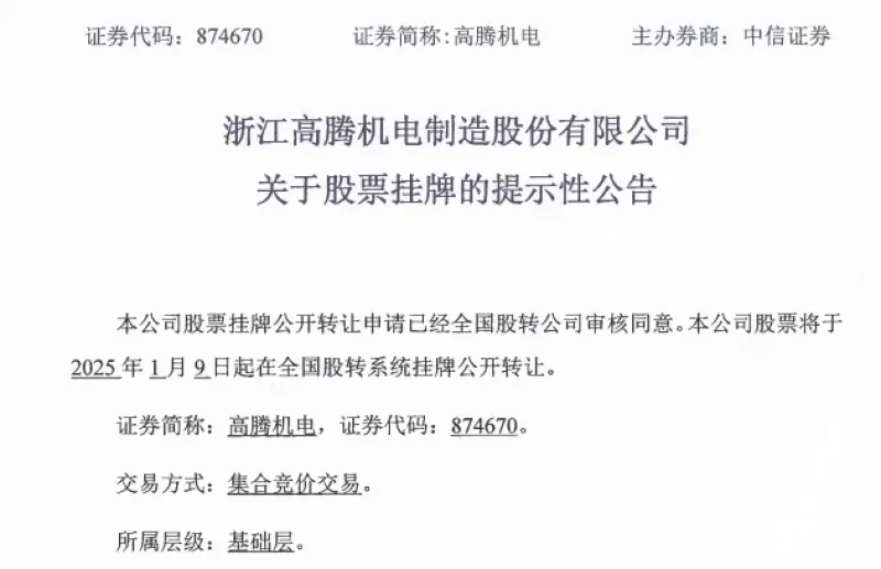 近日,浙江高騰機電制造股份有限公司(以下簡稱“高騰機電”)在新三板基礎層掛牌上市,證券代碼874670。本次掛牌主辦券商為中信證券,其他中介機構還包括律所中倫、會計師中匯。