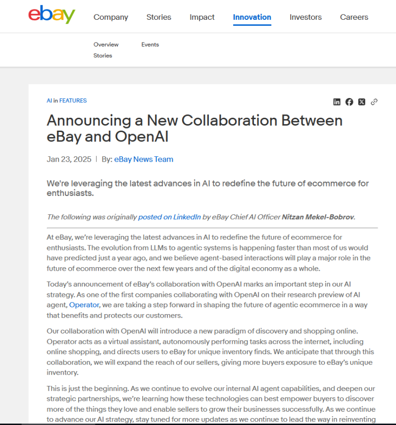 1月25日消息,eBay近日宣布與OpenAI合作,這標志著其AI戰略邁出了重要一步。eBay稱:“作為首批與OpenAI合作研究AI智能體Operator的公司之一,我們在塑造代理電子商務的未來方面邁出了一步,這種方式既有利于客戶,又能保護客戶。”