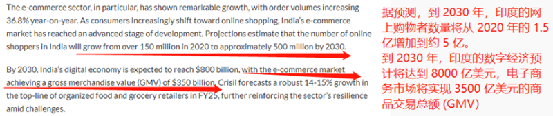 前不久,科爾尼研究公司發(fā)布了一項(xiàng)數(shù)據(jù),其中顯示印度電商市場正在加速生長,預(yù)計到2025年底該市場的估值將達(dá)到77.7億美元。而印度的數(shù)字經(jīng)濟(jì)規(guī)模到2030年時有望飆升至驚人的8000億美元,電商商品交易總額將激增至3500億美元,電商訂單量預(yù)計同比大漲36.8%,電商購物者數(shù)量也預(yù)計將會從2020年的1.5億增加到5億。