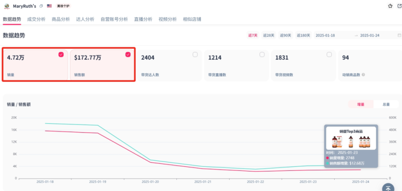 近日,一款專注頭發健康的液體復合維生素在美國市場火出圈了。據Fastmoss數據顯示,在過去7天(1.18-1.24)該產品共售出了4.72萬單,拿到了172.77萬美金的銷售額。值得一提的是,該產品還在幾周前登上過TikTok美區最周熱銷榜榜一位置,實力不容小覷。