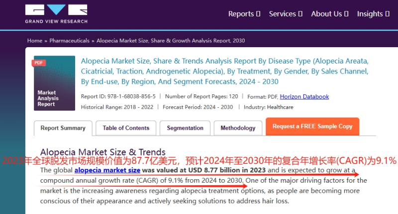 據Grand View Research的調研數據,2023年全球脫發市場規模為87.7億美元,并且這一數字還在繼續增長,預計2024年至2030年,復合年增長率將達到9.1%。以美國市場為例,據研究數據顯示,約有5600萬美國人在被脫發問題困擾,其中包括3500萬男性和2100萬女性。