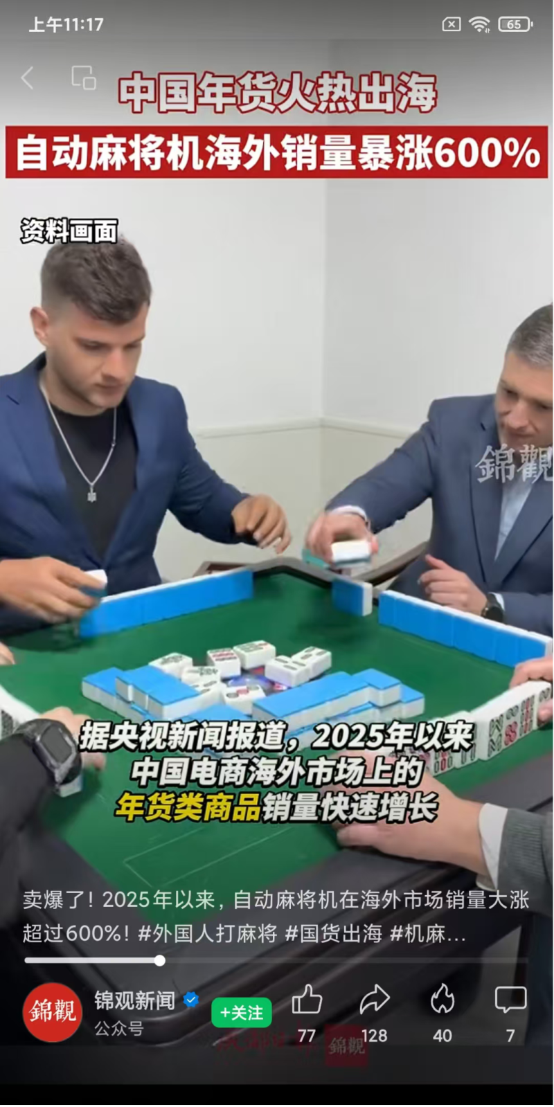 自動(dòng)麻將機(jī)走紅海外 圖源:錦觀新聞視頻號(hào)