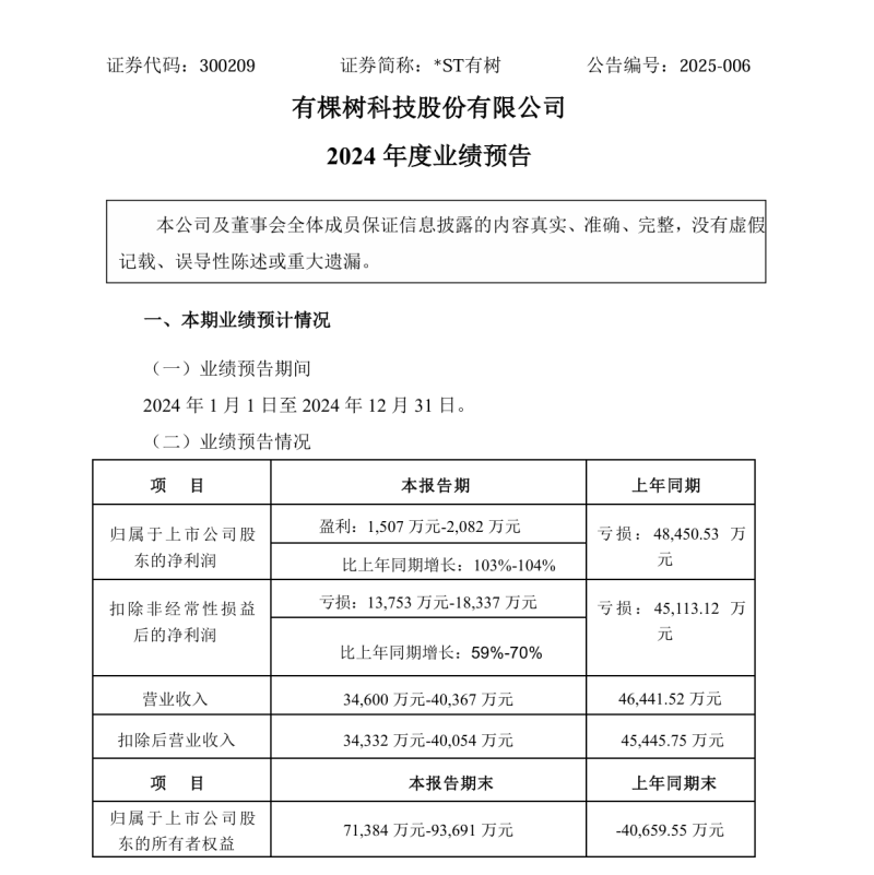 報(bào)告顯示,有棵樹2024年收入34,600萬(wàn)元-40,367萬(wàn)元,上年同期為46,441.52萬(wàn)元;扣除后營(yíng)業(yè)收入為34,332萬(wàn)元-40,054萬(wàn)元,上年同期為45,445.75萬(wàn)元。截至本報(bào)告期末,歸屬于上市公司股東的所有者權(quán)益為71,384萬(wàn)元-93,691萬(wàn)元,上年同期為-40,659.55萬(wàn)元。