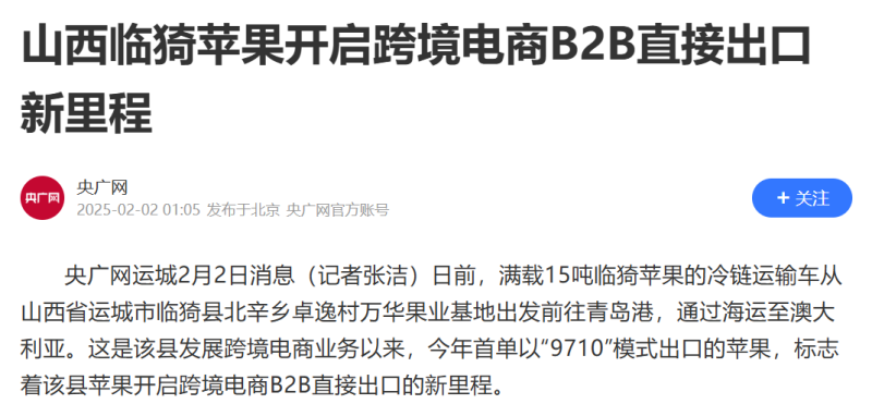 2月4日消息,滿載著15噸臨猗蘋果的冷鏈運輸車近日從山西省運城市臨猗縣北辛鄉卓逸村萬華果業基地出發前往青島港,通過海運至澳大利亞。這是臨猗縣發展跨境電商業務以來,今年首單以“9710”模式出口的蘋果,標志著該縣蘋果開啟跨境電商B2B直接出口的新里程。