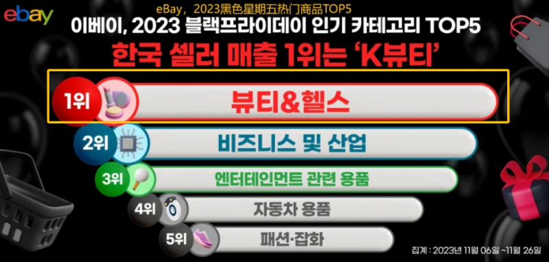 就全球市場規(guī)模來看,數(shù)據(jù)分析網(wǎng)站Statista指出,預(yù)計2025年全球美容個護市場的收入有望達到6772億美元,在2025年至2030年期間將以3.37%的復(fù)合年增長率繼續(xù)增長。在實際的銷售中,美妝品類也用業(yè)績證明了自己的實力,在eBay公布的2023年黑五期間韓國賣家銷量最高的五大熱門品類中,排名第一的便是“美容與健康”。