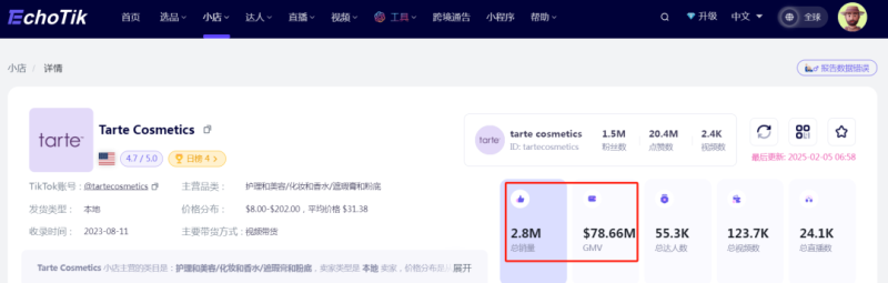 根據(jù)Echotik統(tǒng)計的數(shù)據(jù),僅在最近的30天Tarte Cosmetics的TikTok美區(qū)小店就賣出了超過250萬件產(chǎn)品,預(yù)估帶來640萬美金(約合人民幣4660萬)的銷售額。自2023年8月份以來,該品牌的銷量更是達到了驚人的280萬件,創(chuàng)造了7866萬美金(約合人民幣5.7億元)的銷售額。無疑,Tarte Cosmetics已經(jīng)成為TikTok美區(qū)一匹正在狂奔著的黑馬。
