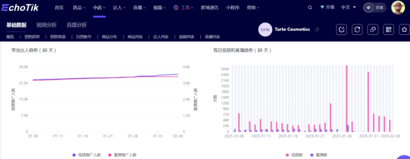 數(shù)據(jù)顯示,在過去的30天,Tarte Cosmetics發(fā)布了超過1.4萬個視頻,展開了1800場直播,新增達人數(shù)2600個。在直播過程中,達人們耐心講解護膚和彩妝的使用技巧,并實時回答用戶問題,這種互動方式大大增加了用戶的親切感和信任感。