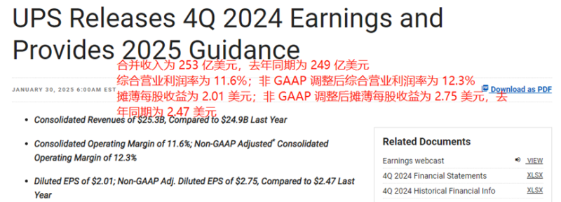 近日,全球快遞業巨頭UPS(聯合包裹)公布了2024年第四季度財報。財報數據顯示,該季度UPS綜合收入為253億美元,相較于上一年同期小幅增長了1.5%;綜合營業利潤達到了29億美元,同比明顯增長了18.1%;非GAAP調整后每股攤薄收益也同比增長11.3%至2.75美元。