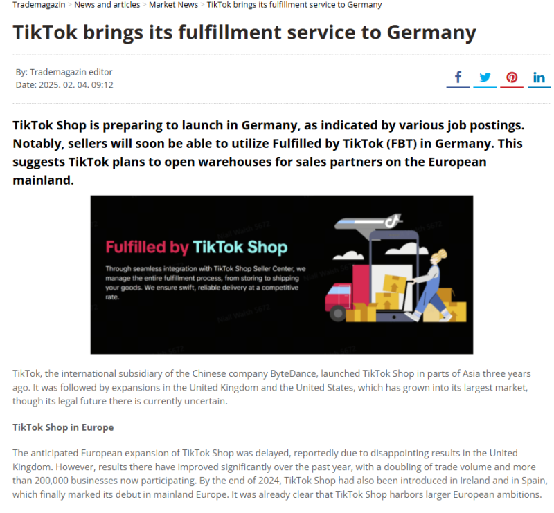 2月5日消息,有市場消息稱,TikTok Shop即將進入德國市場,并推出TikTok物流服務(Fulfilled by TikTok,FBT)。