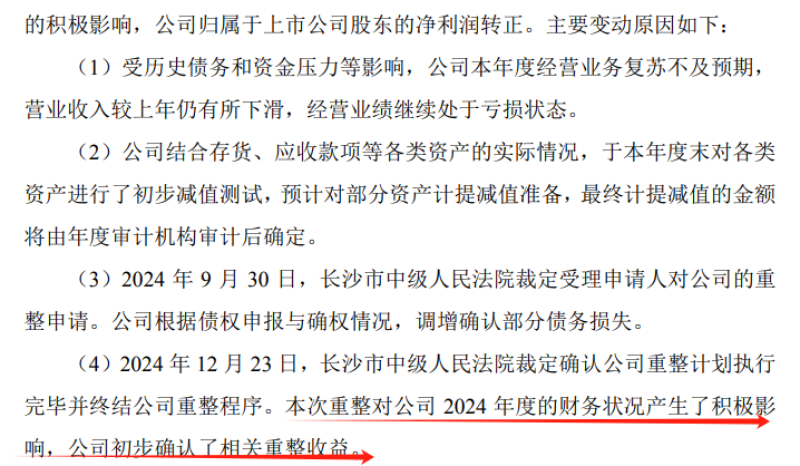 從營(yíng)收方面來(lái)看,受歷史債務(wù)和資金壓力等影響,公司經(jīng)營(yíng)業(yè)務(wù)復(fù)蘇不及預(yù)期,經(jīng)營(yíng)業(yè)績(jī)繼續(xù)處于虧損狀態(tài);從盈利方面來(lái)看,公司結(jié)合存貨、應(yīng)收款項(xiàng)等實(shí)際情況,預(yù)計(jì)對(duì)部分資產(chǎn)計(jì)提減值準(zhǔn)備、根據(jù)債權(quán)申報(bào)與確權(quán)情況,調(diào)增確認(rèn)部分債務(wù)損失。