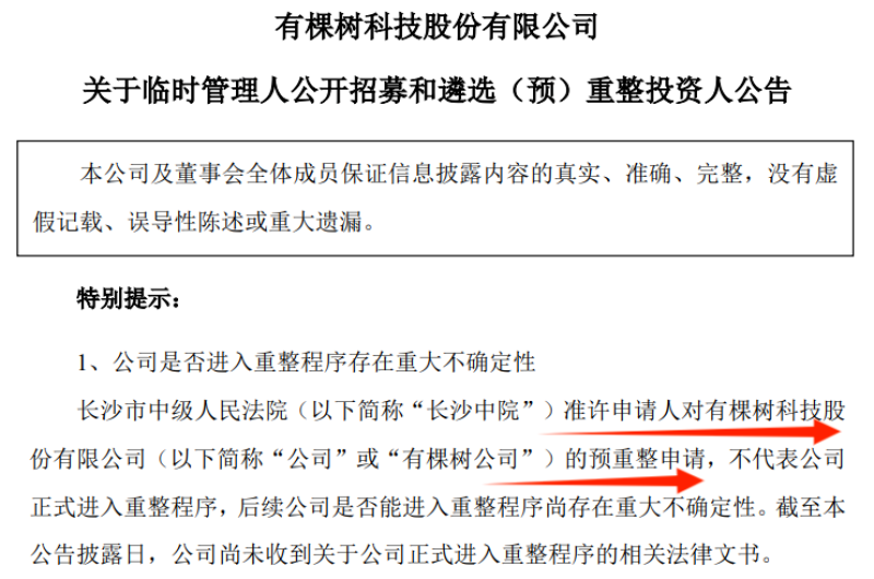 有棵樹科技進(jìn)入預(yù)重整程序 圖源:有棵樹
