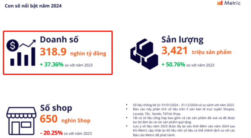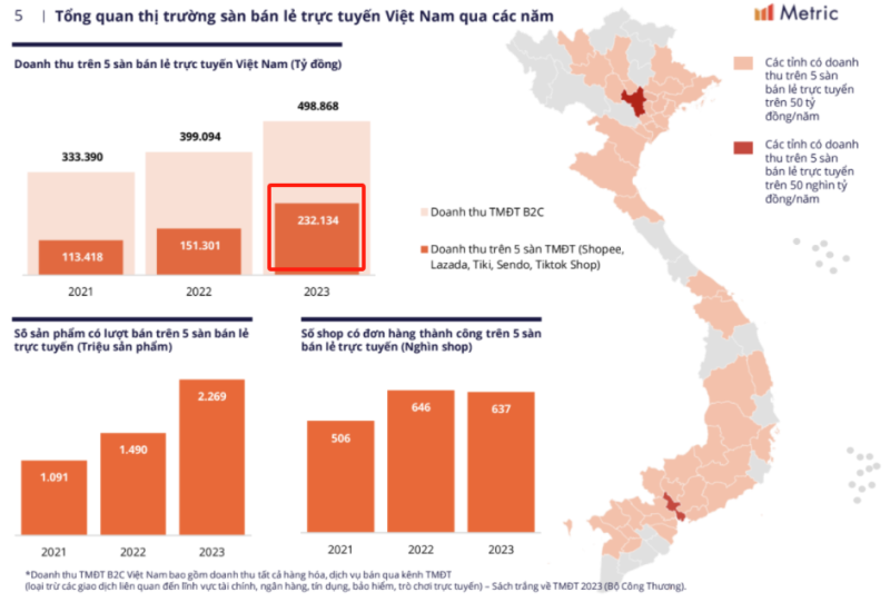 Metric的數據指出,2023年越南這五大電商平臺的總收入為232.1萬億越南盾,同比增長53.4%;2024年前兩個月的銷售額總額已超過40萬億越南盾,同比增長51%;2024年上半年銷售額總額高達143.9萬億越南盾,較去年同期增長54.91%。可以看到,每一次的統計數據與之前比起來漲幅都超過了50%,其實力可見一斑。