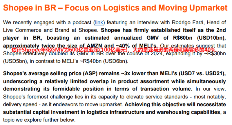 最近,拉美企業投資銀行Itaú BBA發布了一項關于Shopee巴西公司的研究報告,2024年,Shopee在巴西的銷售額實現翻倍增長,達到約600億雷亞爾(約合10.3億美元),是亞馬遜收入的兩倍,美客多的40%(僅巴西市場)。由此,Shopee在巴西也一躍成為第二大電商平臺。
