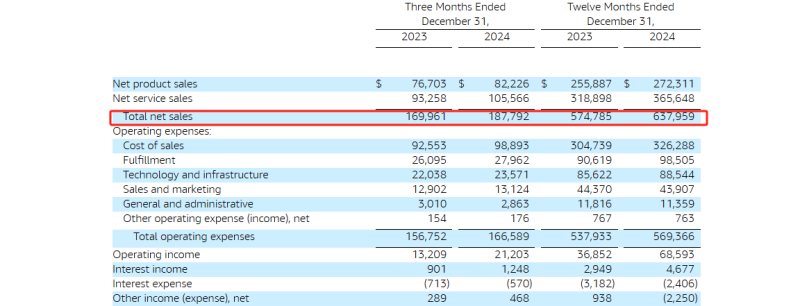 財報顯示,亞馬遜2024年第四季度凈銷售額同比增長10%,達到1878億美元,除去本季度外匯匯率同比變動帶來的9億美元不利影響,凈銷售額與2023年第四季度相比增長了11%。本季度,亞馬遜的凈利潤為200億美元,每股攤薄收益為1.86美元,而2023財年第四季度,亞馬遜的凈利潤為106億美元,每股攤薄收益為1.00美元。