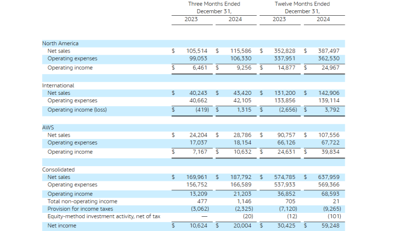 2024年全年,亞馬遜的凈銷售額為6380億美元,與2023財年的5748億美元相比增長11%,不計入匯率變動所帶來的23億美元的負面影響,亞馬遜2024財年凈銷售額同樣為同比增長11%。亞馬遜2024年的凈利潤為592億美元,每股攤薄收益為5.53美元,同比均大幅增長,而在2023財年,亞馬遜的凈利潤為304億美元,每股攤薄收益為2.90美元。