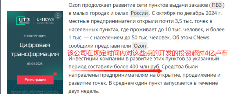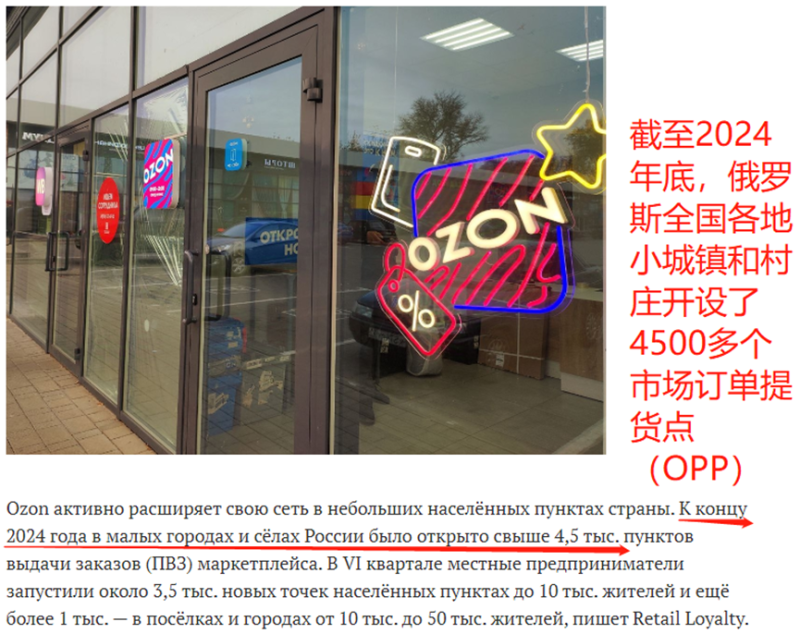 俄羅斯電商巨頭Ozon自然深知這個道理。該平臺正在加快編織物流網絡,尤其是小城鎮和村莊的物流網絡。數據顯示,截止到2024年,Ozon在人口不足1萬的小城鎮地區開設了近3500個訂單提貨點(OPP)網點,在人口不足5萬的地區開設了1000多家門店。平均而言,每兩周內就會啟動一個新站點。
