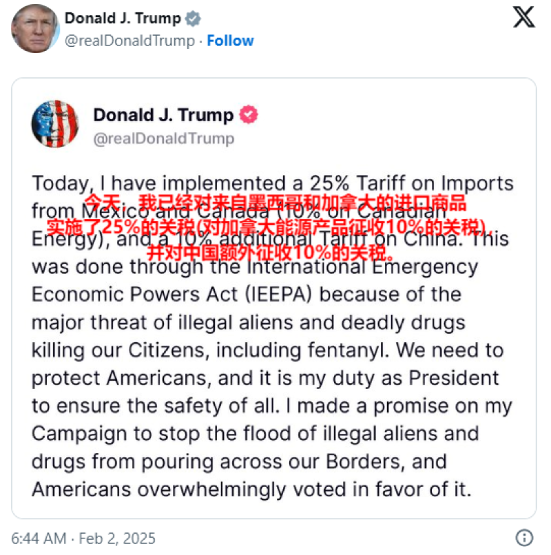 進入2月,更劇烈的變動接踵而至。美國總統(tǒng)特朗普簽署行政令,宣布對中國進口商品加征10%的關(guān)稅,同時暫停中國進口商品的最低限度貿(mào)易豁免,此前這項豁免政策允許價值低于800美元的包裹免付關(guān)稅。