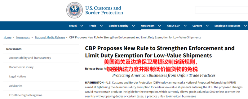 就在上個月,美國海關(guān)和邊境保護局(CBP)發(fā)布了兩項通知,一是將擬定低價值貨物入境規(guī)則(ELVS),進一步規(guī)范低價值貨物的入境信息要求,將低價值貨物入境信息填寫流程全面電子化,以加強對此類進口貨物的監(jiān)管力度,確保海關(guān)能夠有效查驗并追蹤非法商品。